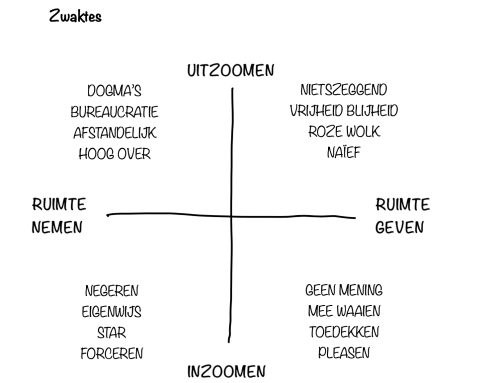Deze oefening helpt je om bewuster te schakelen tussen ruimte nemen, ruimte geven, uitzoomen en inzoomen. Als leidinggevende reageer je soms onbewust, vaak zonder te zien welk effect jouw positie heeft op de ander. Door met het kwadrant te werken, ontdek je patronen, krijg je zicht op wat het moment vraagt en creëer je meer professionele ruimte. Het maakt je flexibeler, effectiever en duidelijker in je leiderschap.